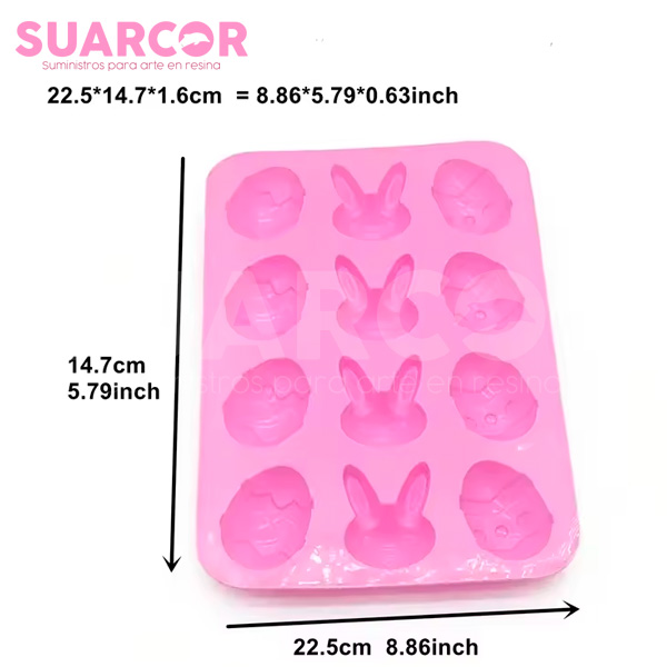 molde de silicon con 12 cavidades en forma de de huevos de pascua y conejos